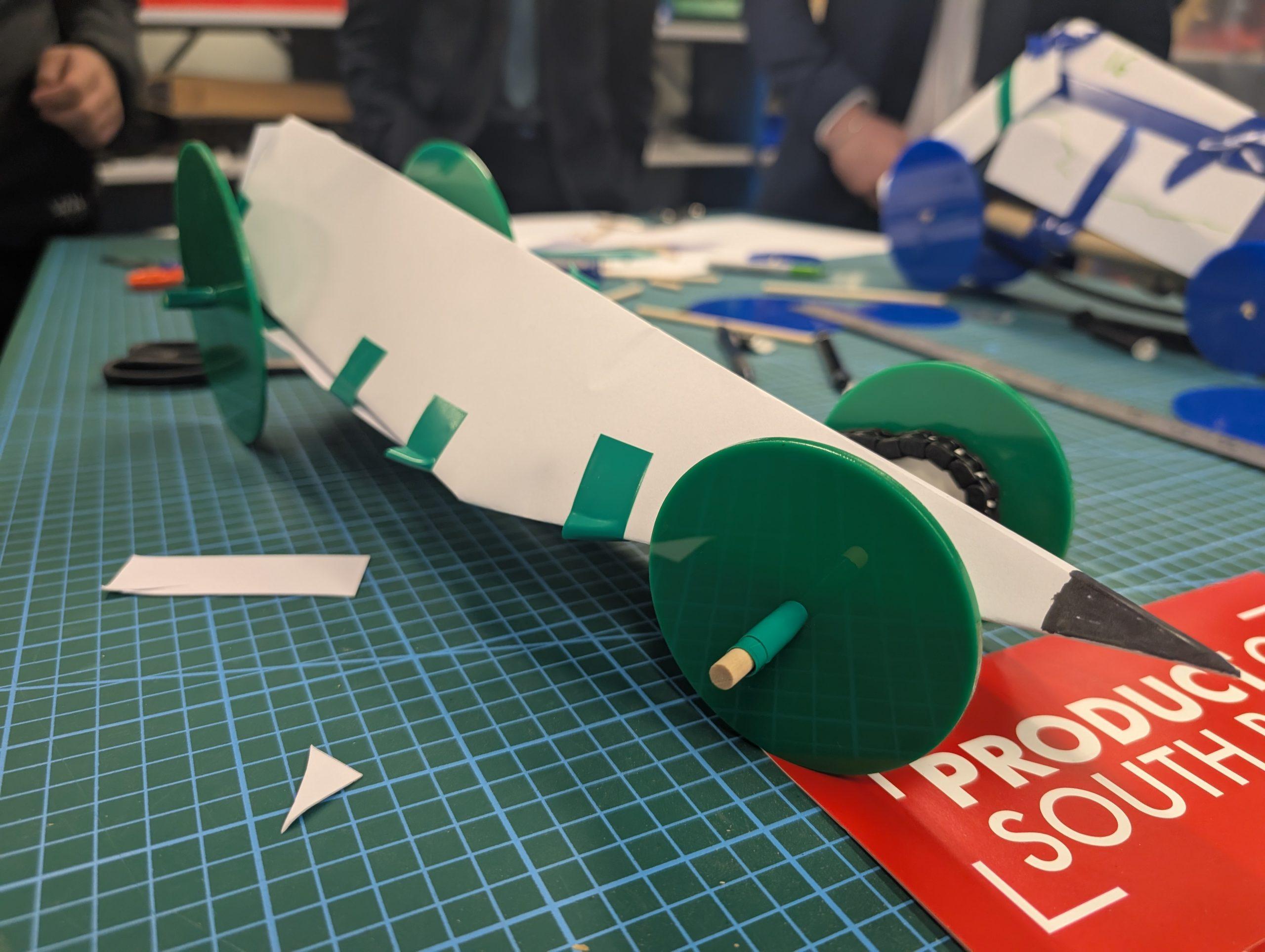 Speed Racer Prototype: The competitive spirit came out for this challenge! Students had to design and create a speed racer prototype that could travel as fast and straight as possible, with the constraint of using three or more wheels. This activity really tested their understanding of aerodynamics, stability, and materials.