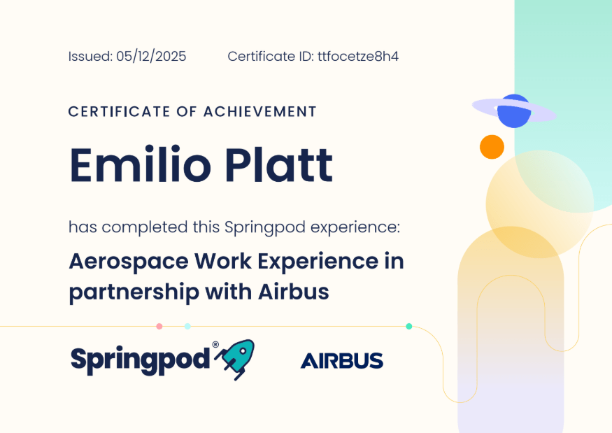 I am very proud of our Year 10 student Emilio, who has shown outstanding commitment and determination by successfully completing the Airbus Virtual Work Experience Programme in his own time during lunchtimes last week.