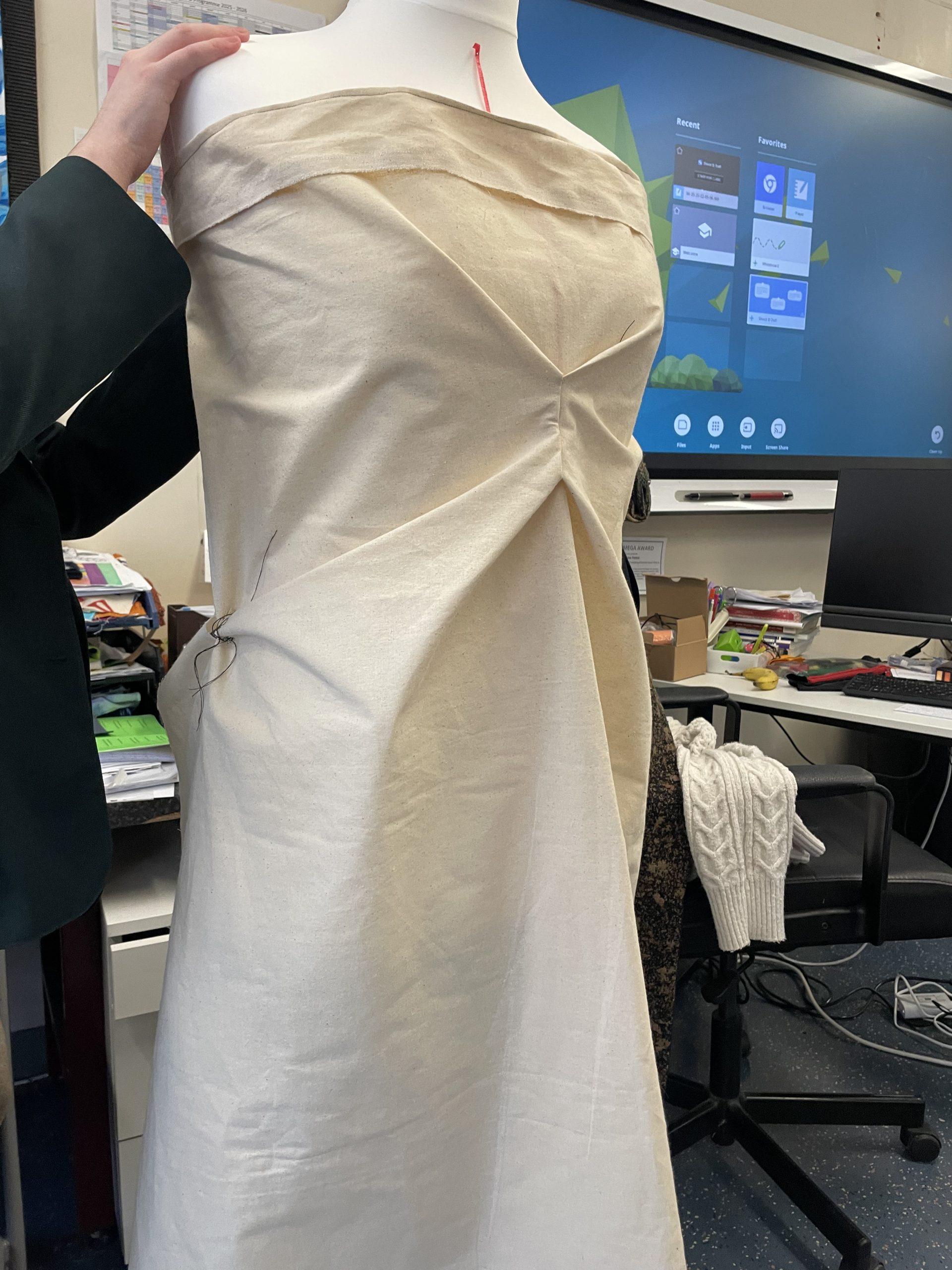 With guidance from Usha, students were encouraged to ‘break rules’ and simply ‘play’ with the fabric, to see where it would take them. Using provided materials, students experimented with intricate folds and geometric cuts to see how fabric behaves. The classroom was filled with “toiles” (prototype garments) that showcased a range of sophisticated techniques, from delicate gathering to bold, architectural drapes.